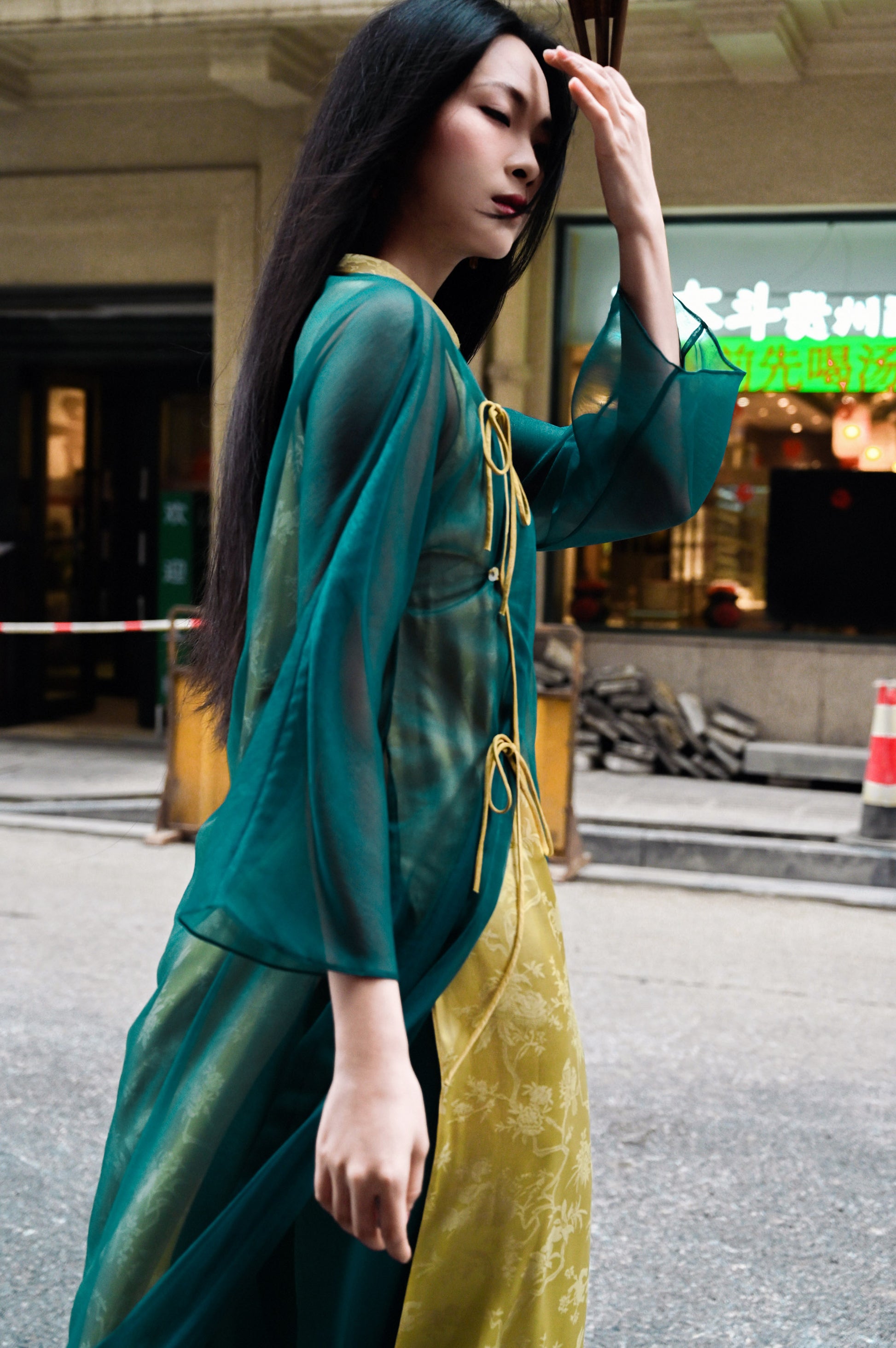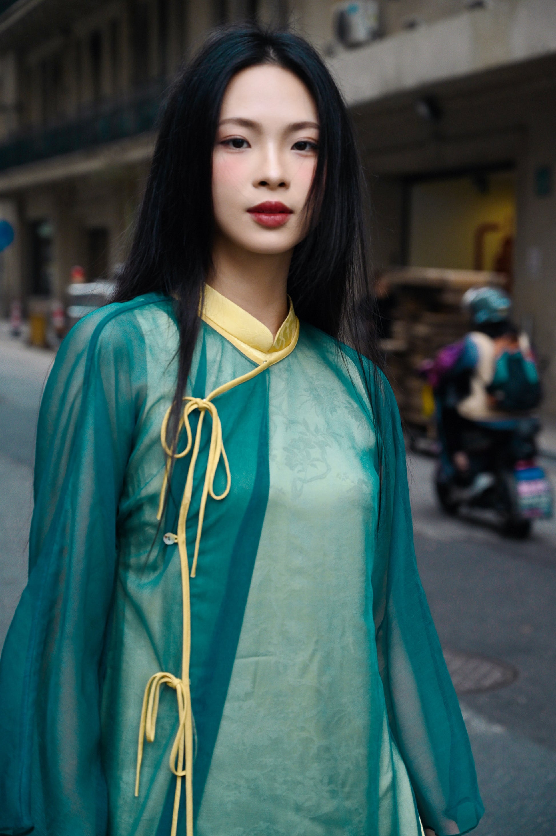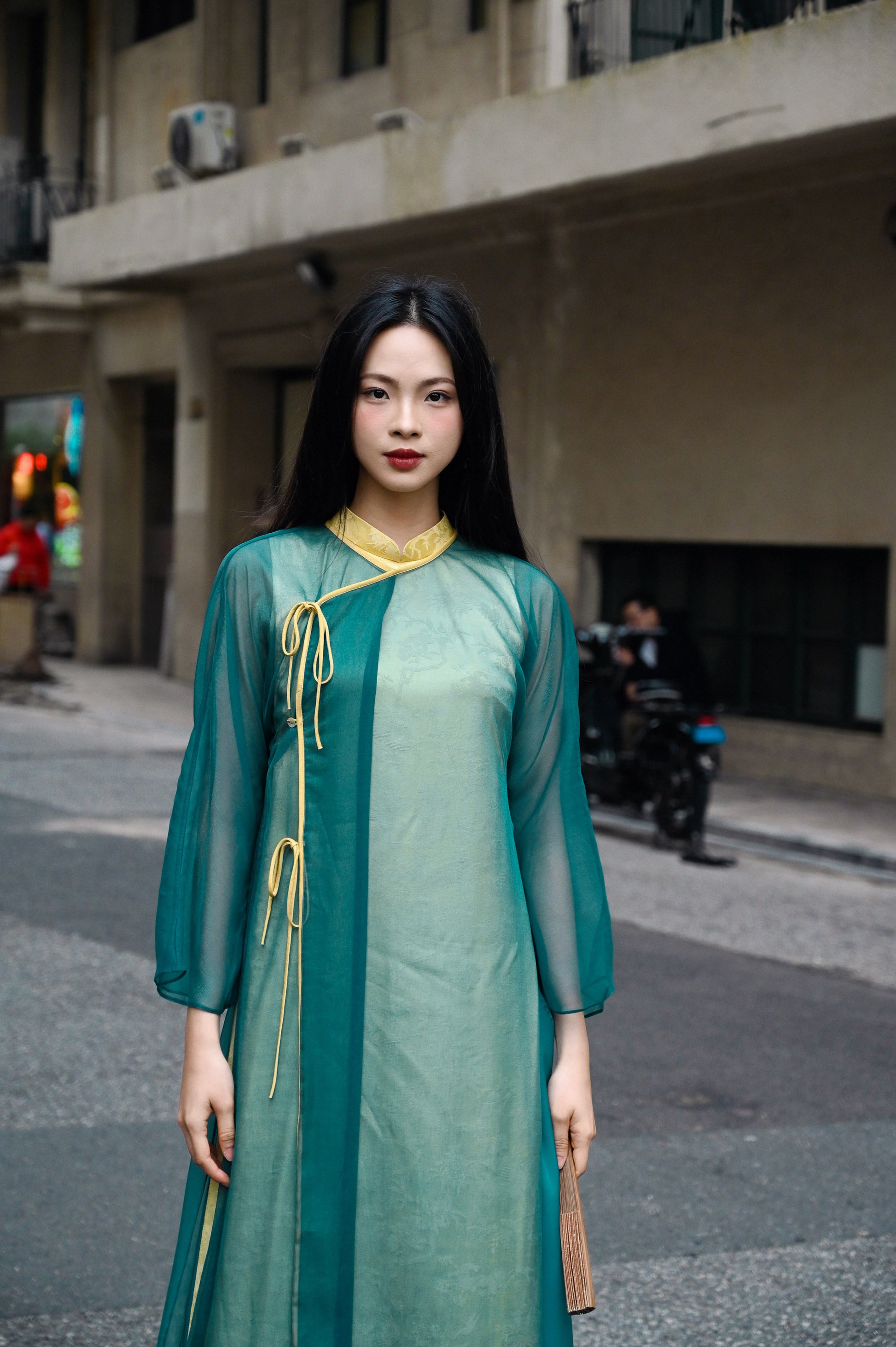 - Có hàng nơ buộc,cúc cài, cúc đóng phía trước