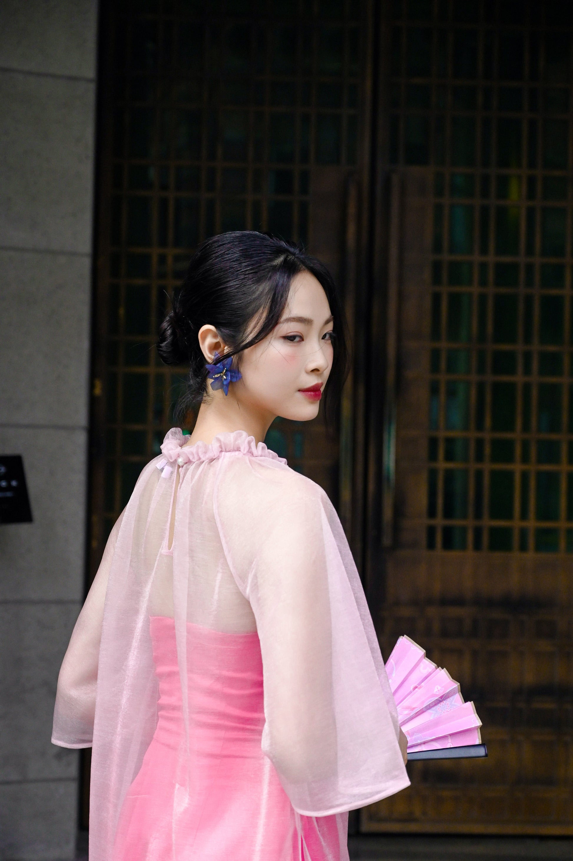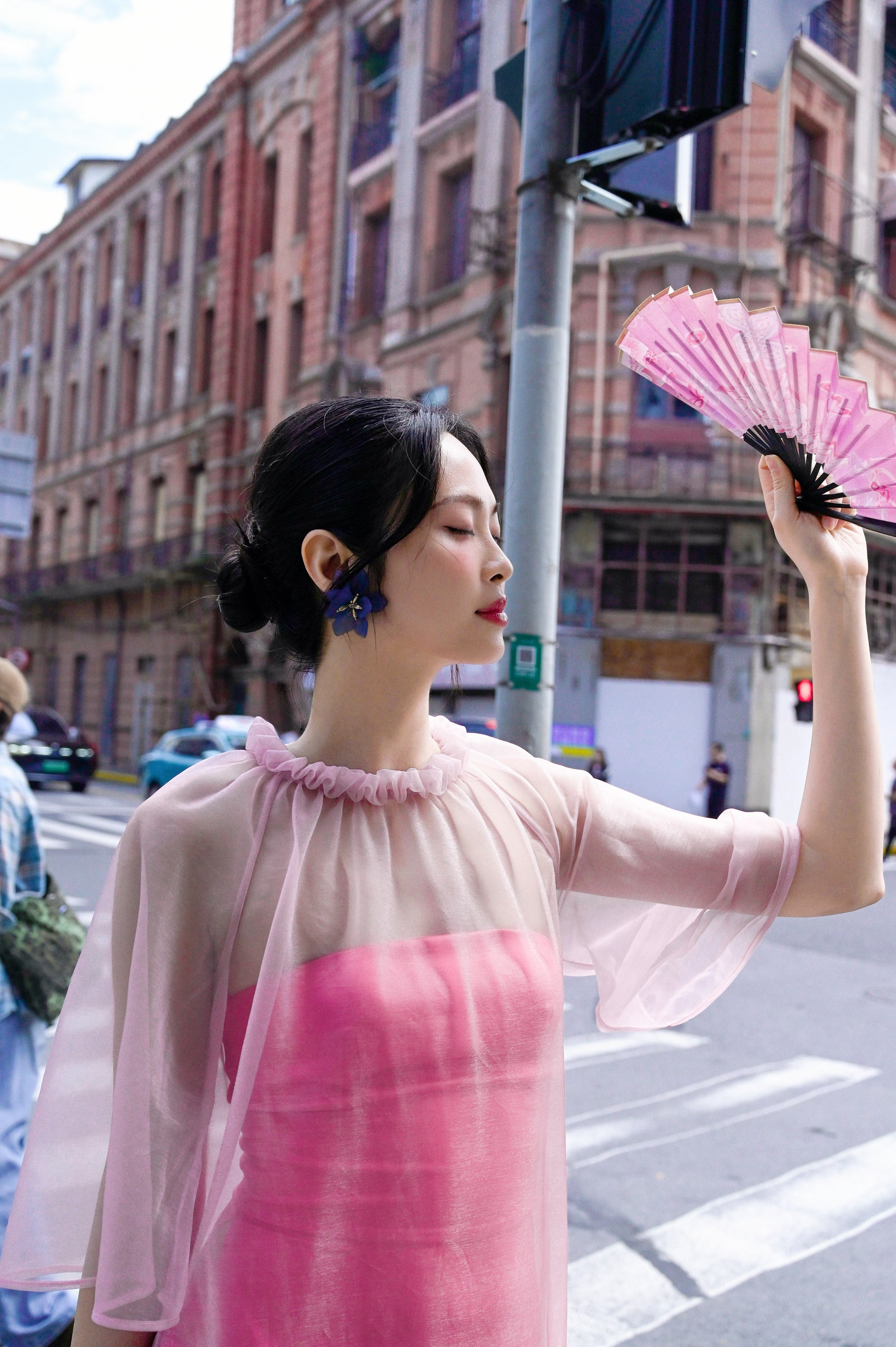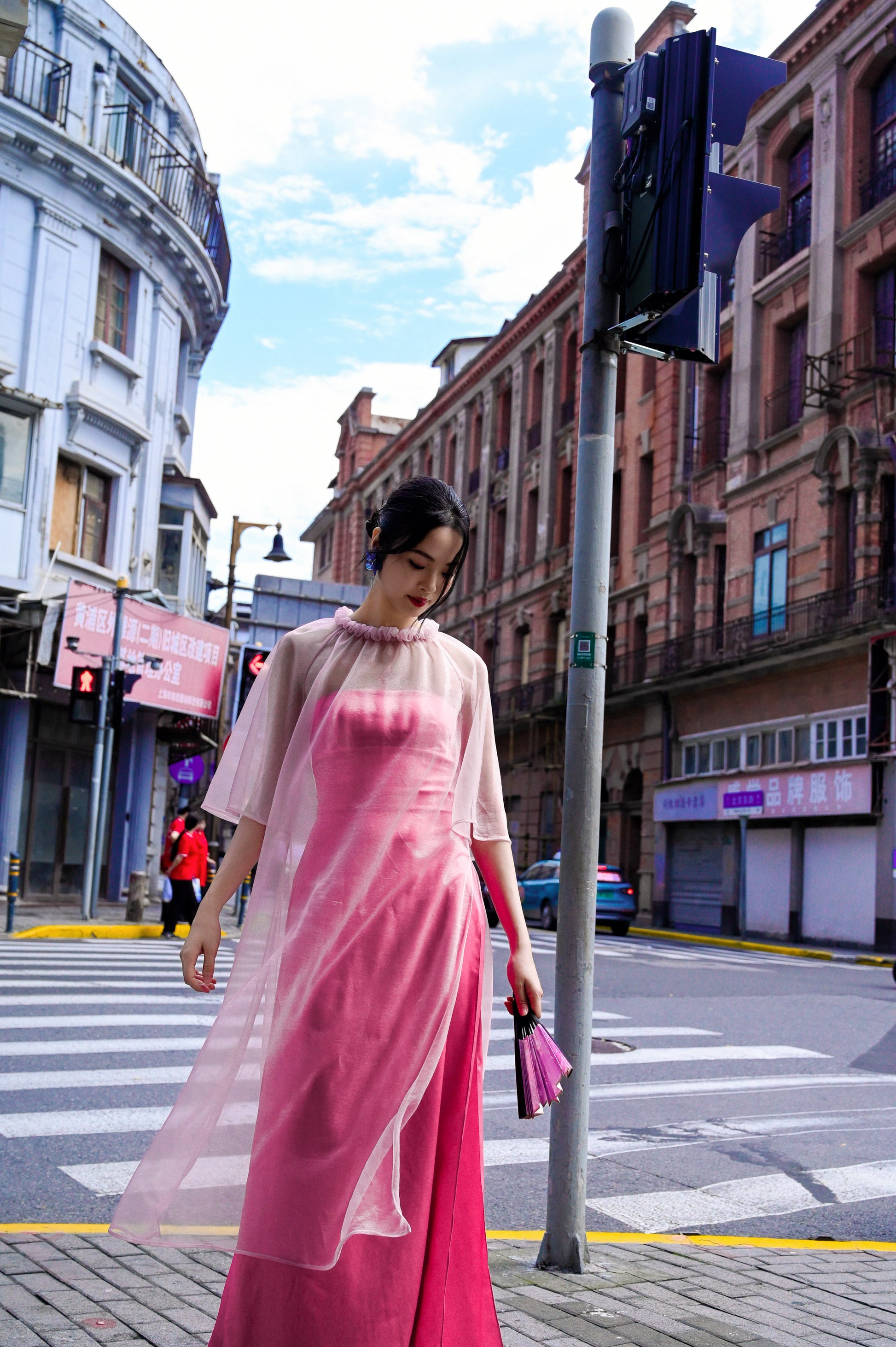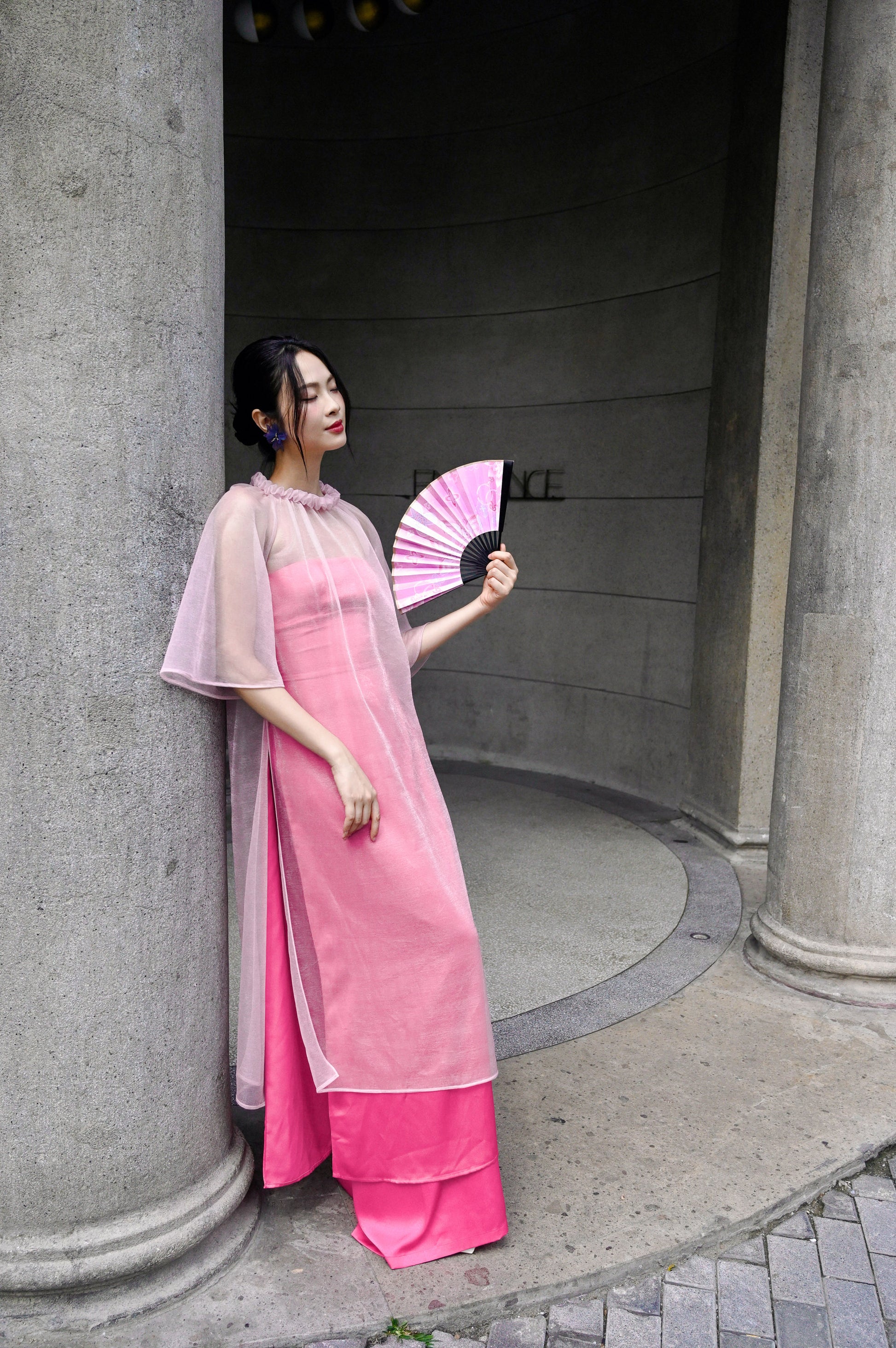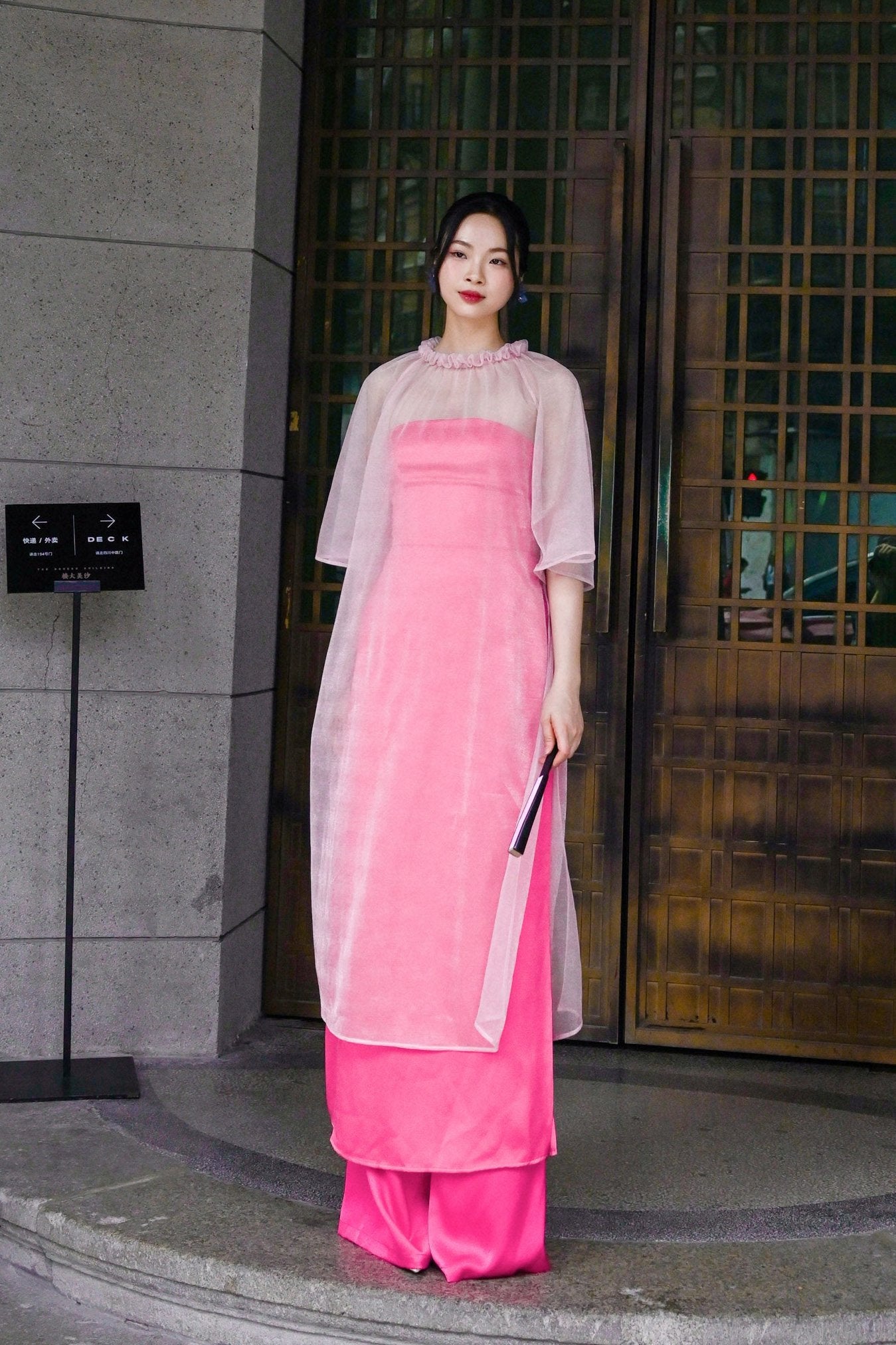 Đầm được tạo nên trong nét ngọc ngà của thước gấm hoa rạng rỡ màu của Tết, trong ẩn hiện nếp tơ sóng sánh như suối mây. Những vân hoa yêu kiều thanh tú dập dìu sau tha thướt ánh tơ bồng bềnh, nhấn nhá bằng những nếp xếp nhún ôm gọn cổ như chuỗi hoa xuân bừng nở, e ấp sau nụ cười duyên duyên.