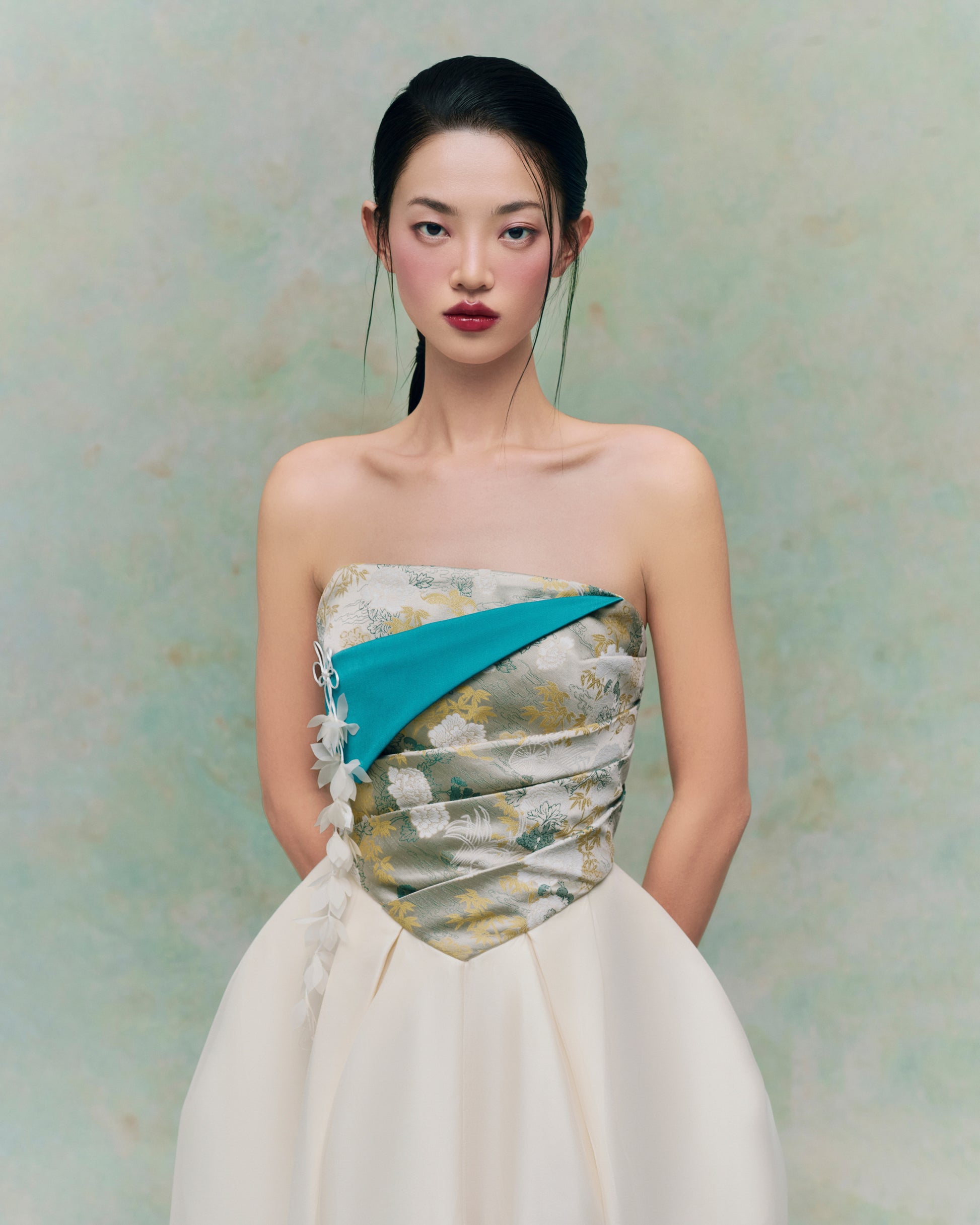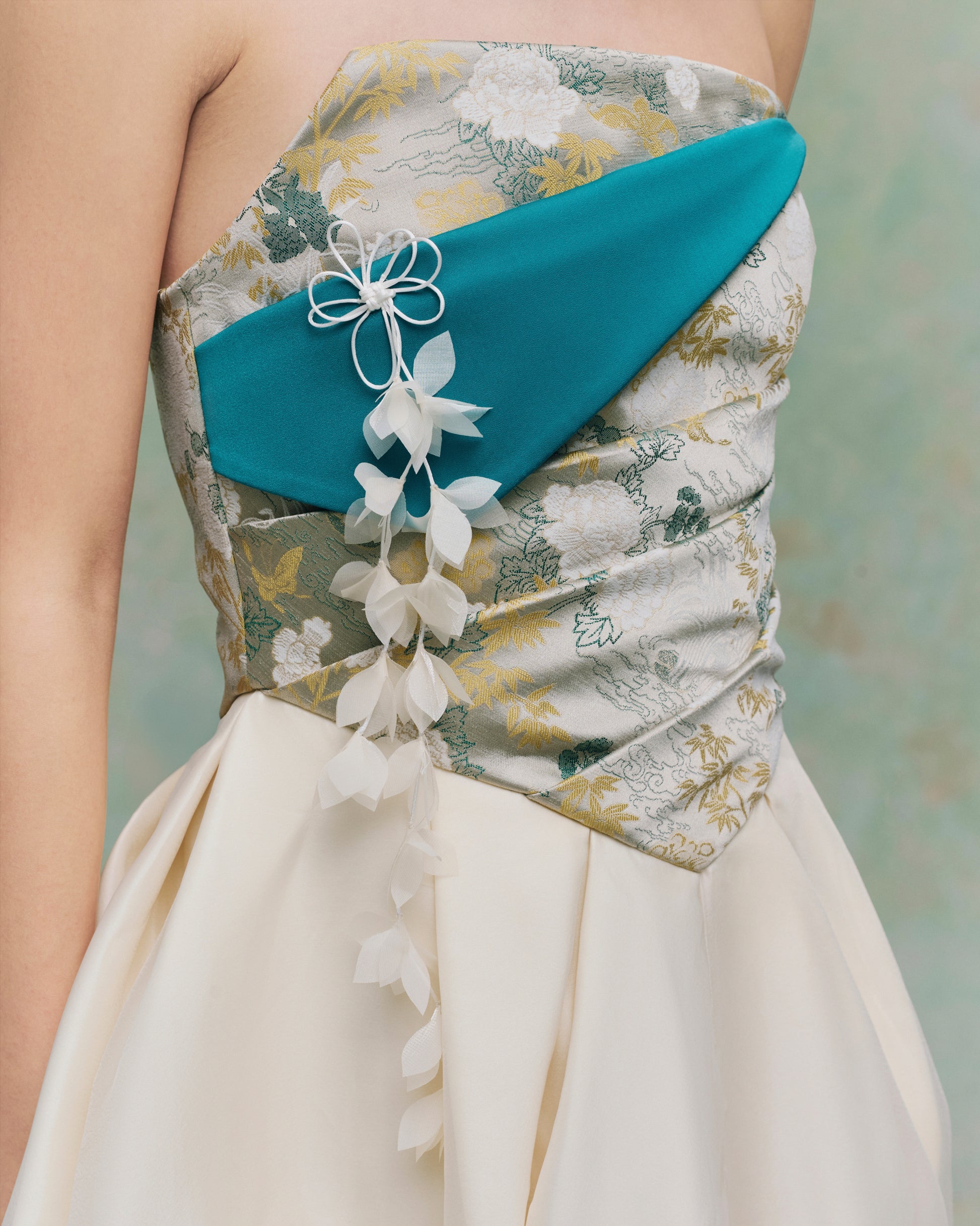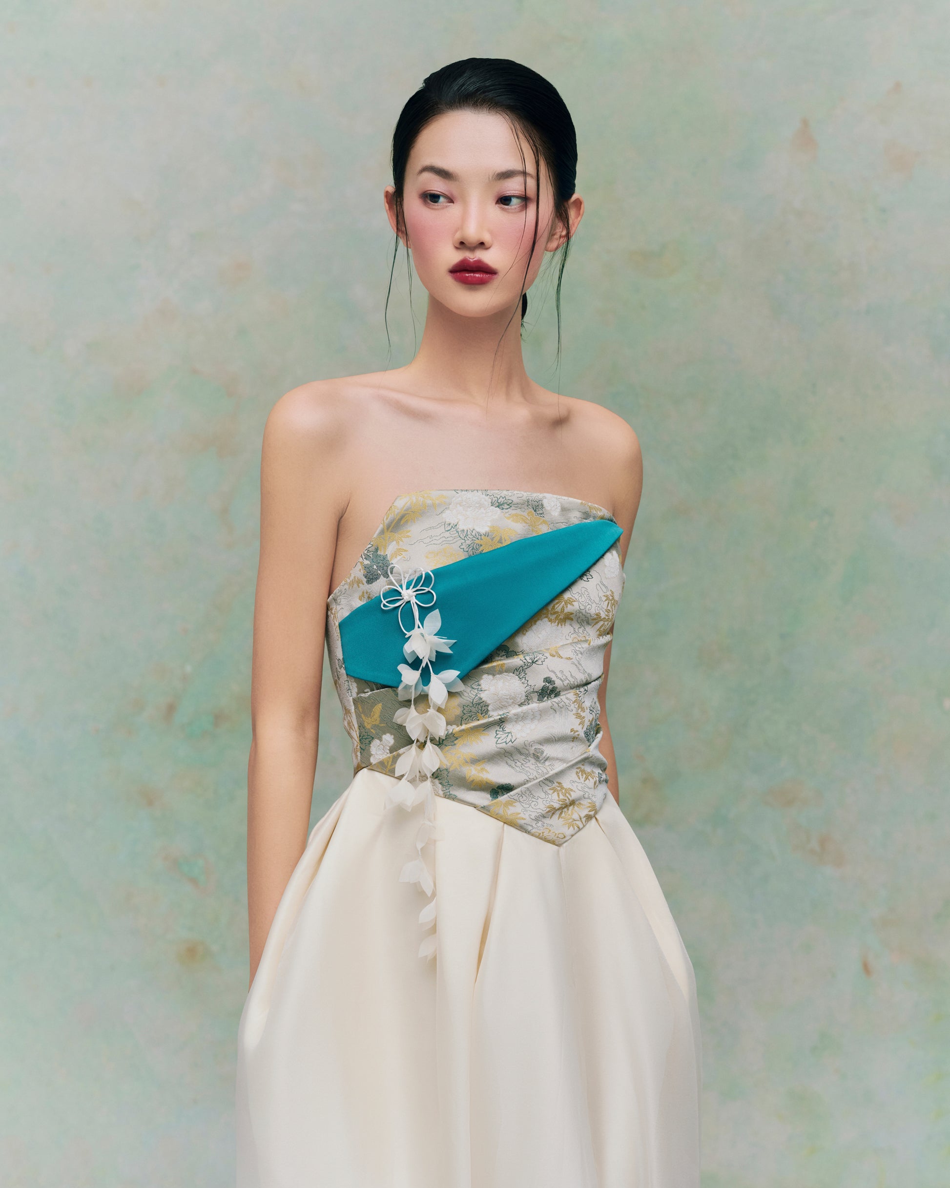 - Thân trên: Gấm thêu hoa phối ngọc trai