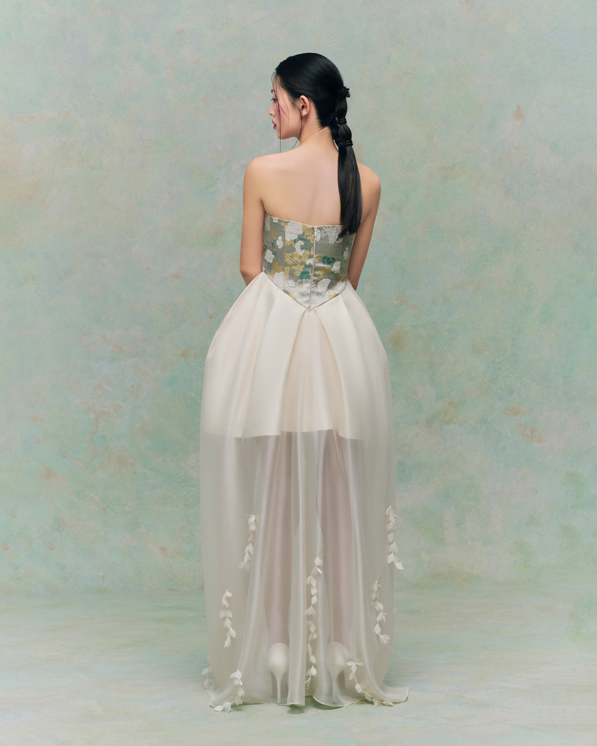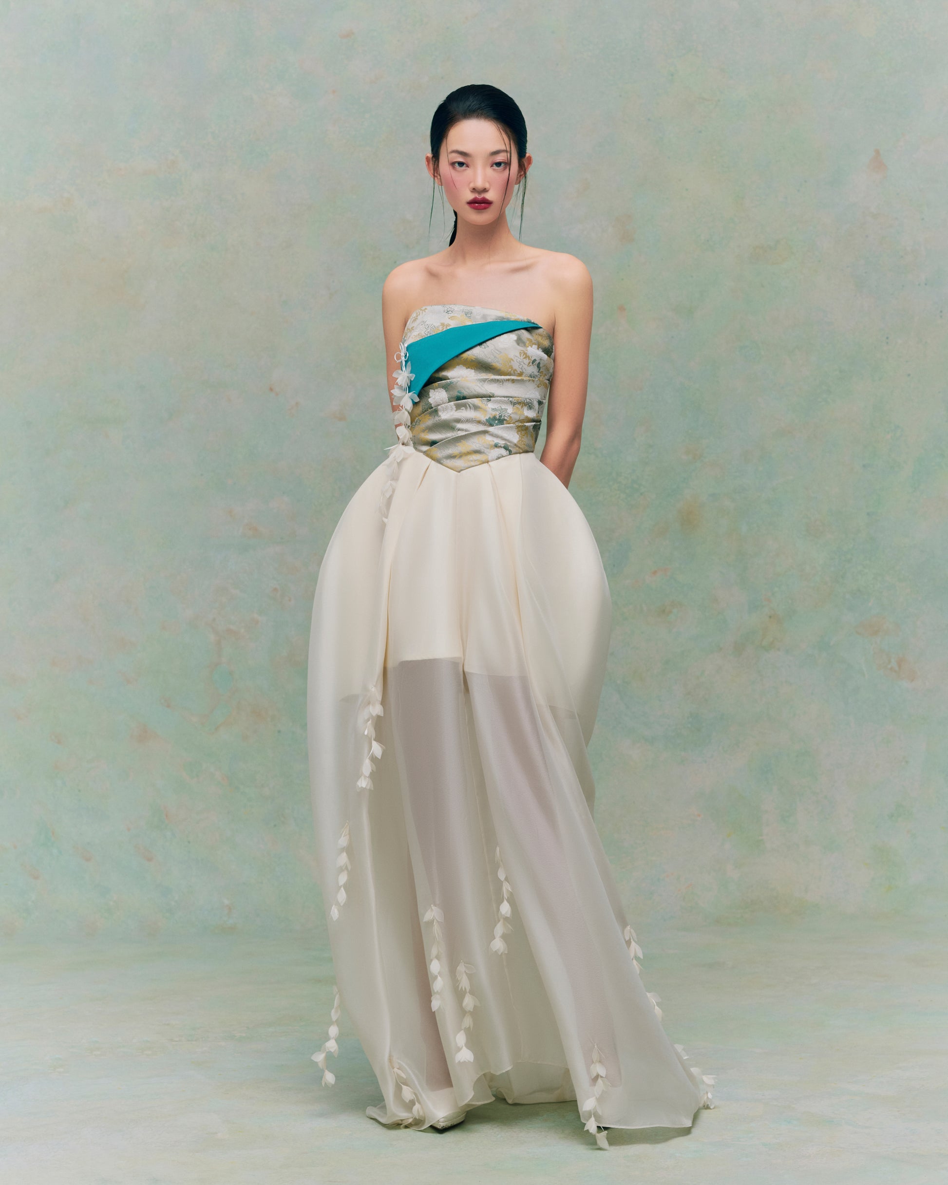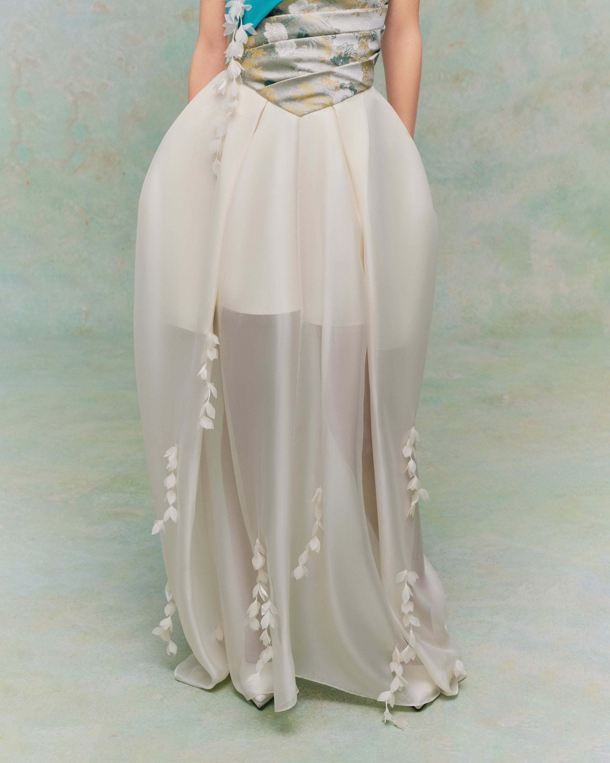 - Thân trên: Gấm thêu hoa phối ngọc trai