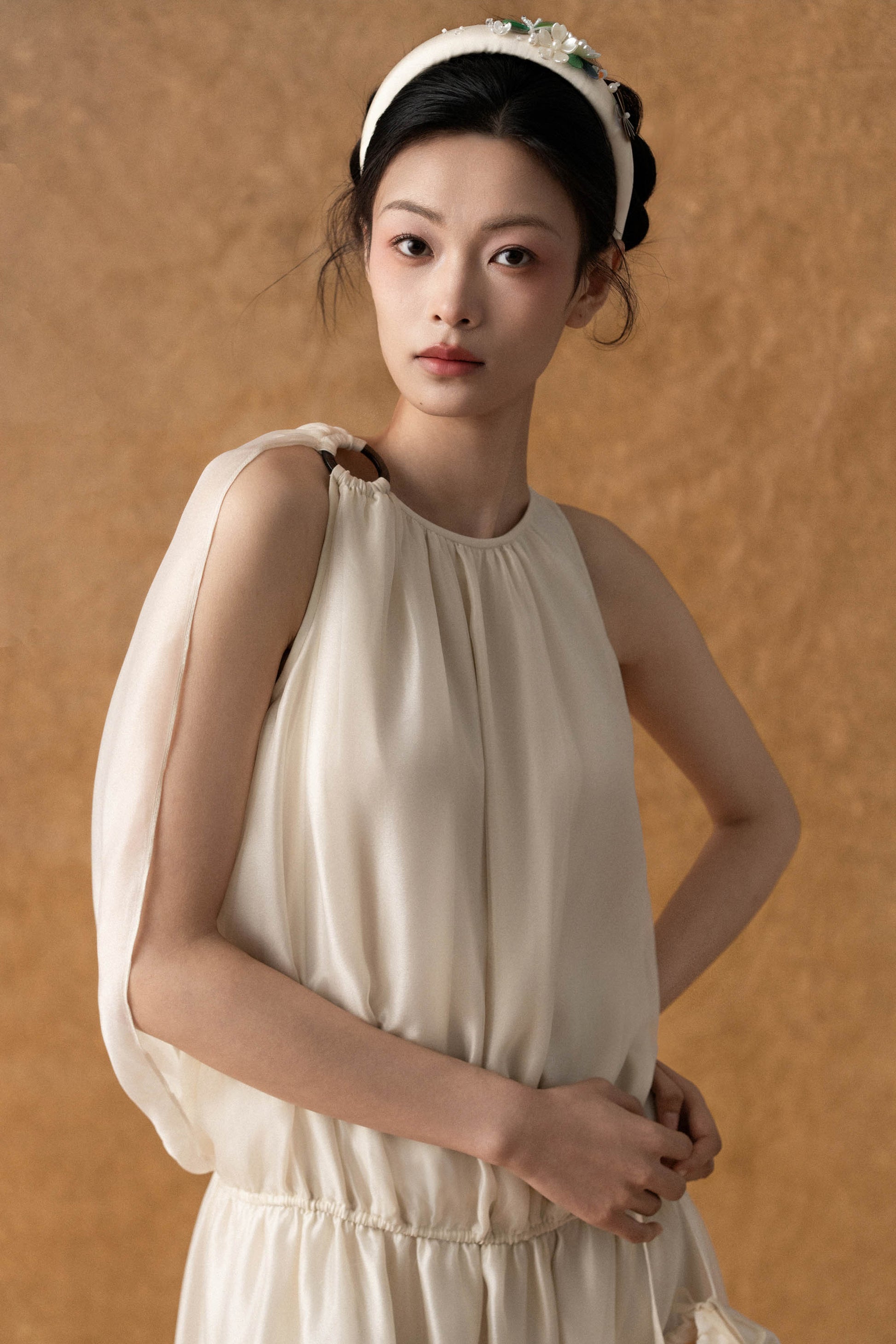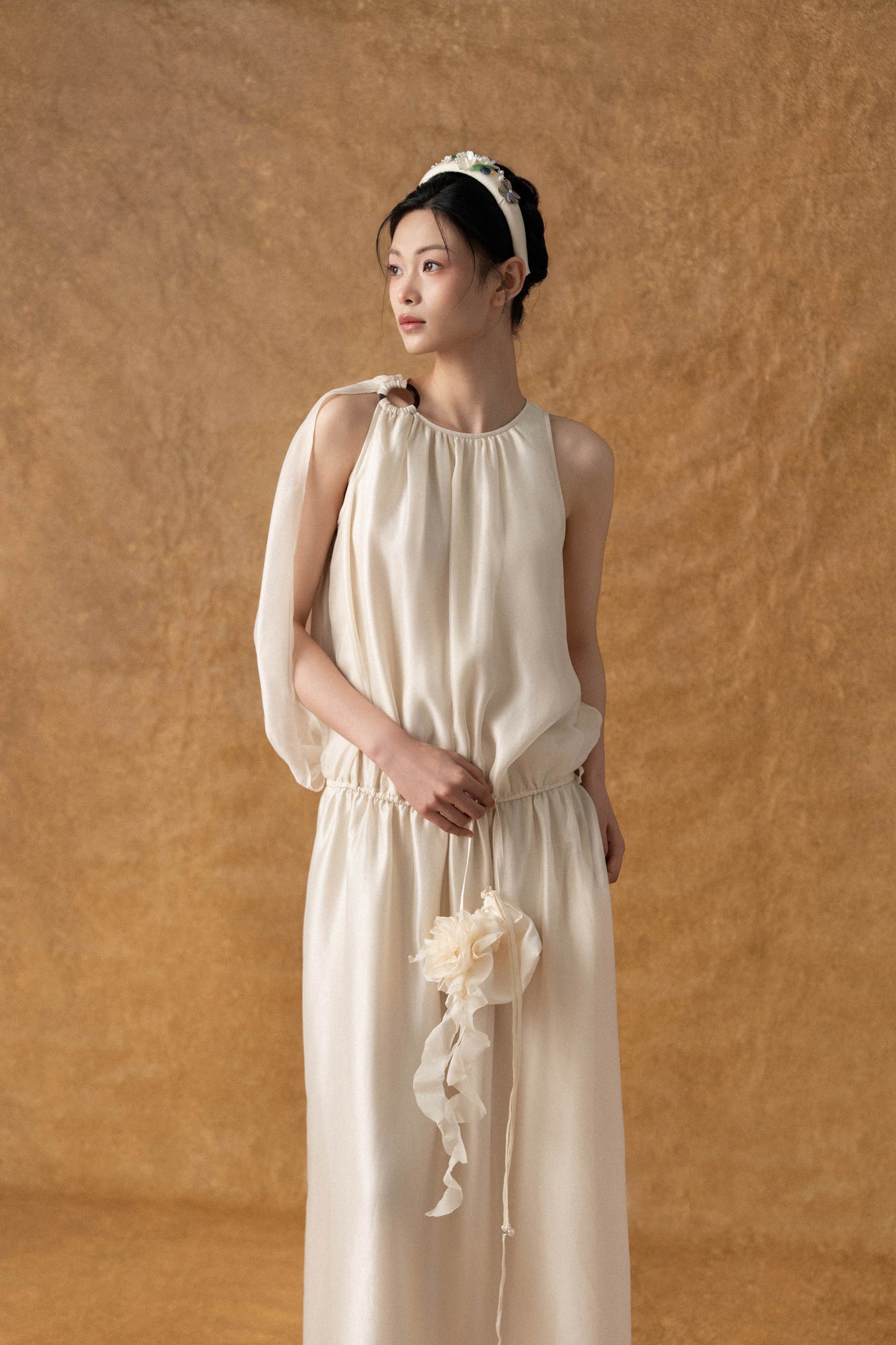 - Phần vai nối liền với lớp choàng rũ nhẹ phía sau